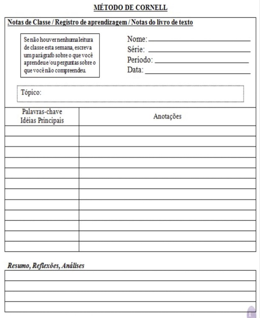 - Palavras-chave: Na coluna estreita à esquerda, escreva palavras-chave ou frases curtas que resumam os pontos principais da seção central. Essas palavras-chave ajudarão você a revisar e revisitar as informações posteriormente de forma mais rápida.