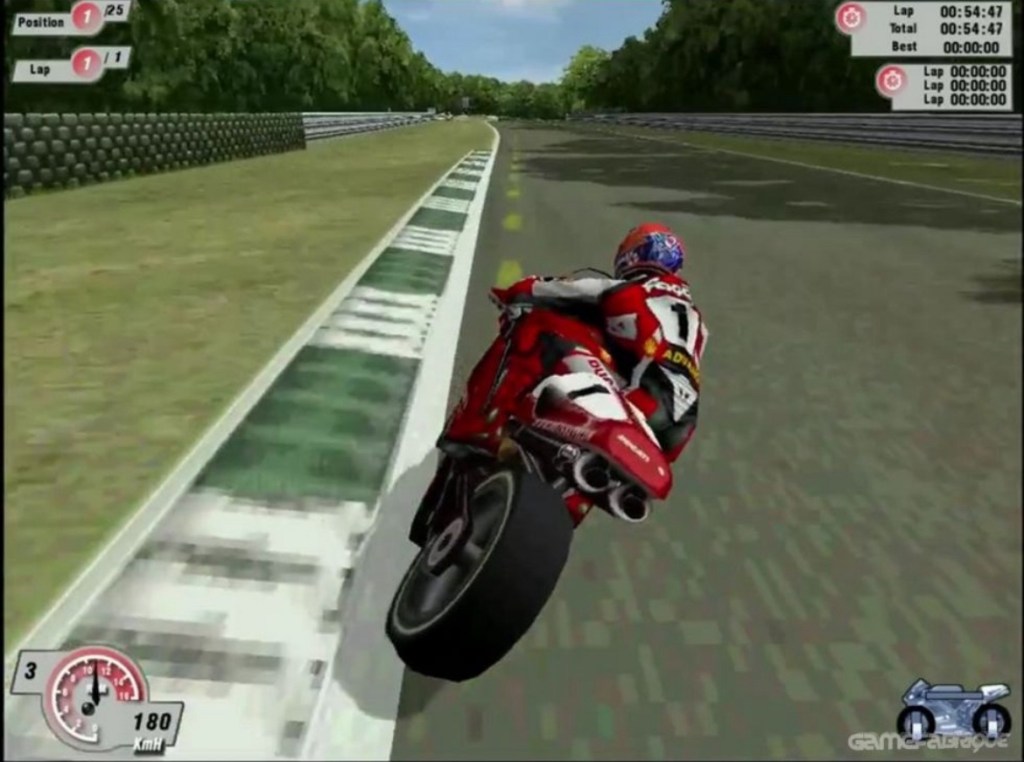 As mesmas duas dúzias de marcações de textura são usadas vezes sem conta, milhares de vezes, para um efeito que é absolutamente espantoso. Aquelas velhas placas com 128MB de VRAM e quatro unidades de execução fizeram um trabalho fantástico de entregar a essência do motociclista a 180 milhas por hora numa linda Ducati, bloqueando os travões no último segundo e mergulhando naquelas chicanes antes de carregar no acelerador para o lançar para fora das esquinas no fio da navalha do desastre.